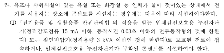 (2) 화장실 등 인체가 물에 젖은 상태로 사용할 가능성이 있는 곳 : 감도 전류 15 mA, 동작 시간 0.03 sec