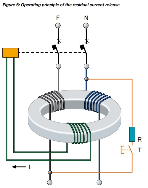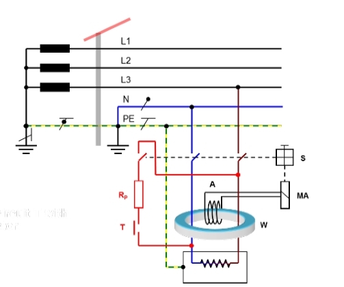 위의 그림에서 T는 테스트 스위치며 동작 시험을 할 수 있도록 삽입되어 있습니다. 주기적으로 테스트가 필요합니다. 다만 운전 중에 누르면 실제로 트립이 되므로 주의가 필요합니다.