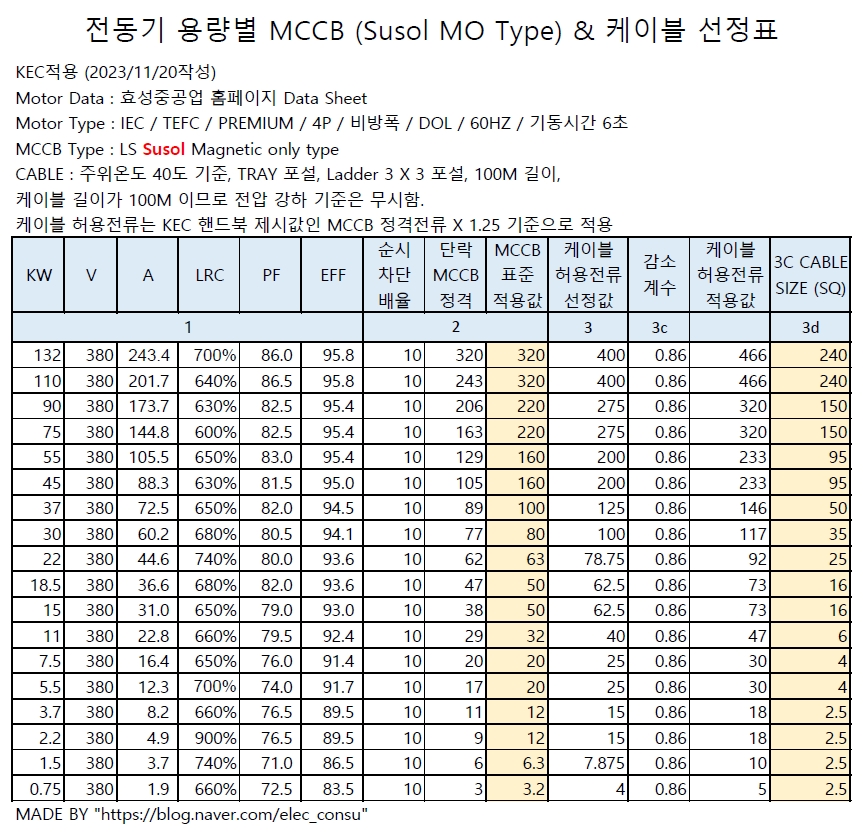 1. 저압 전동기 회로의 MCCB 사이즈와 케이블 사이즈 선정표 (11/20 업데이트)