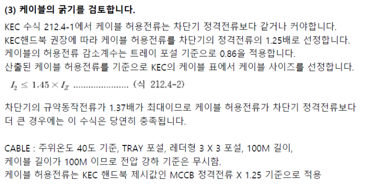 그리고 케이블을 차단기의 정격전류 이상으로 선정하면 케이블의 허용전류에 1.45를 곱한 값이 차단기의 정격전류에 최대 1.37배를 곱한 값보다 항상 클 수밖에 없기 때문에 케이블의 허용전류 선정에도 문제가 없다고 판단하였습니다.