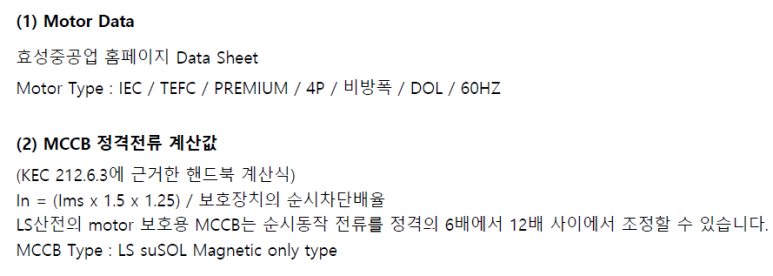 아래의 전동기 보호용 MCCB를 적용하는 기준을 적용해서 MCCB 크기를 결정하였습니다.