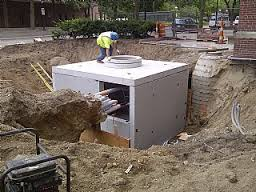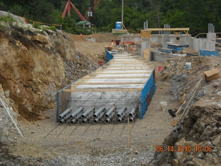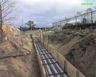 덕트 뱅크는 아래의 사진처럼 땅을 깊이 파고 바닥을 다진 후 전선관을 배치시키고 콘크리트를 타설 할 수 있도록 폼을 설치하고 마지막으로 콘크리트를 타설 하여 마무리하게 됩니다. 물론 흙을 되메우기 하는 마지막 처리가 남아 있습니다.