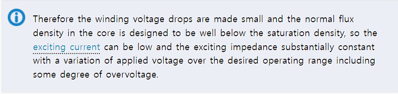 (그러므로 권선의 전압 강하를 작게하고 코어 안에서의 정상 자속 밀도를 포화밀도 이하에서 잘 유지되도록 설계되어야 합니다. 그리고 여자 전류는 작고 여자 임피던스는 어느 정도의 과전압을 포함한 요구되는 운전 범위에서 인가된 전압의 변화에 대하여 대체로 일정해야 합니다.)