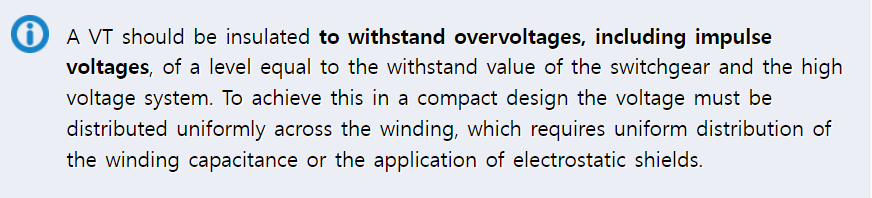 (계기용 변압기는 배전반과 고압 시스템과 동일한 수준의 충격전압과 과전압에 견딜 수 있도록 절연되어야 합니다. 소형화를 위한 설계 속에 이러한 절연을 얻기 위해서 전압은 권선 전체에 걸쳐 일정하게 분포되어야만 합니다. 이는 권선 커패시턴스의 균일한 분포나 정전기 차폐의 적용을 요구합니다.)