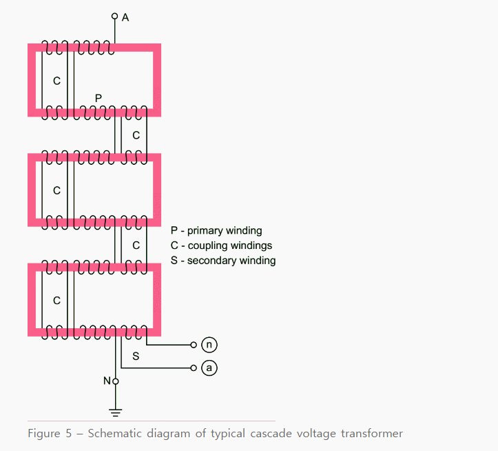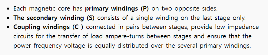 - 커플링 군선이 단계 사이를 연결합니다. 단계들 사이에서 부하 암페어턴의 전달을 위해 낮은 임피던스 회로를 제공하는데 이는 상용주파수 전압이 여러 1차 권선들에 걸쳐 균등하게 분배되는 것을 보장합니다.