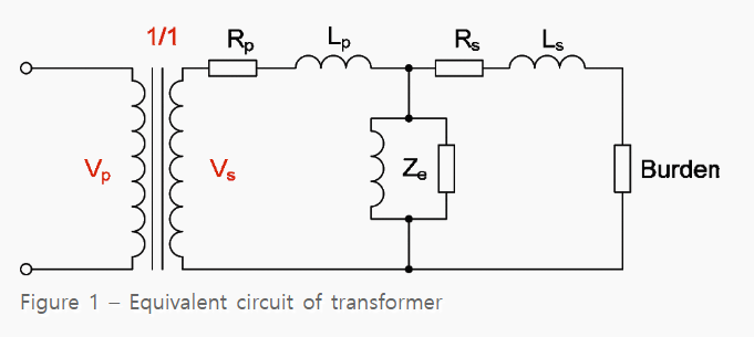전압 변압기는 그림 1의 등가 회로로 나타낼 수 있으며, 여기서 모든 양은 2차 측으로 표시됩니다.