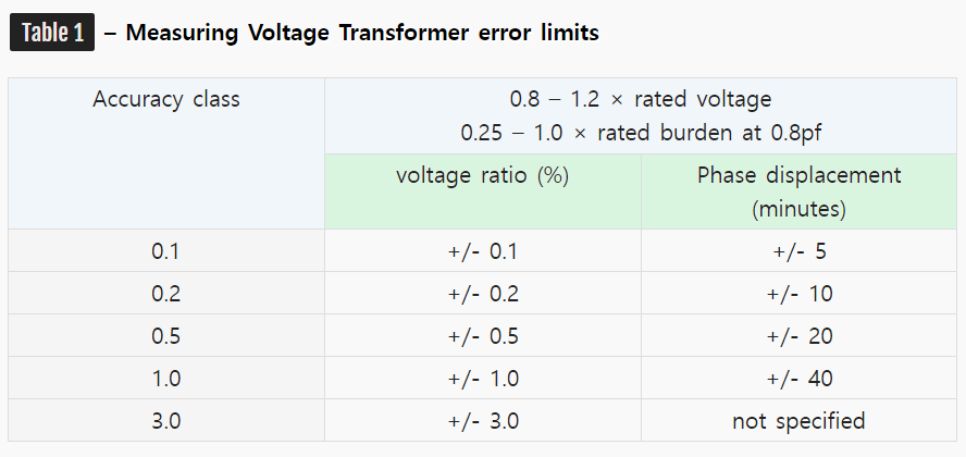 이와 관련된 요구사항은 IEC 60044-2에 명시되어 있습니다. 모든 전압 변압기는 표 1의 등급 중 하나를 준수해야 합니다.