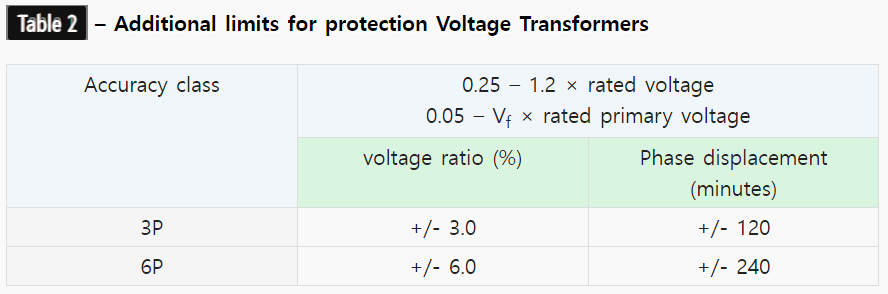 고장 상태에서는 시스템 전압이 낮은 값으로 감소할 수 있으므로 보호 계전기의 동작을 위해 전압 측정의 정확성이 중요할 수 있습니다. 이러한 유형의 서비스를 위한 계기용 변압기는 표 2에 명시된 확장된 요구사항 범위를 준수해야 합니다.