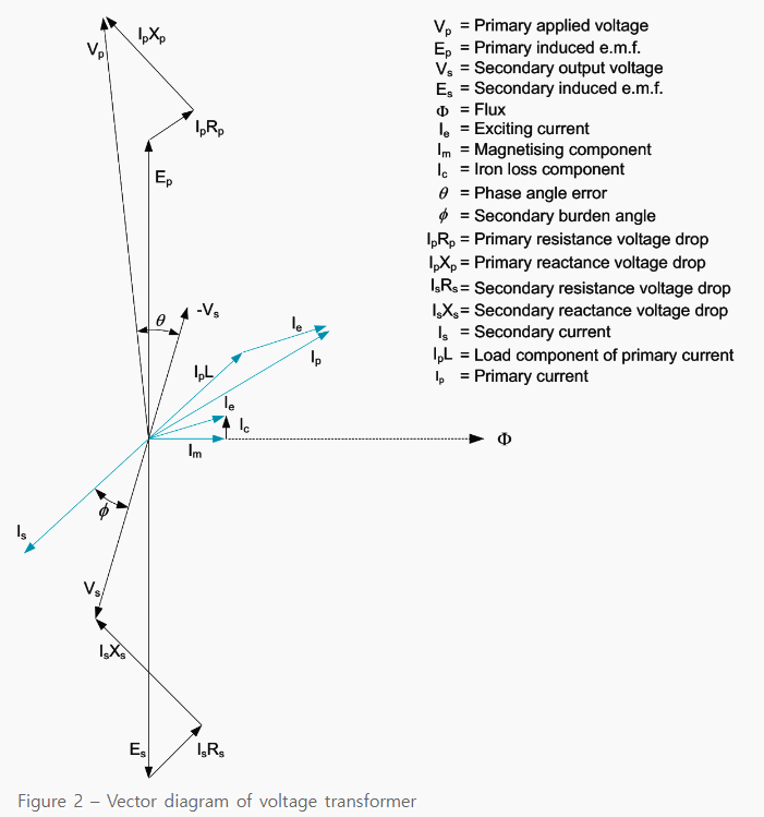 위상 오차는 반전된 2차 전압 벡터와 1차 전압 벡터 사이의 위상 차입니다. 반전된 2차 전압이 1차 벡터를 앞설 때 양의 값을 갖습니다.