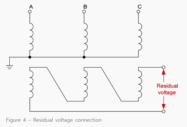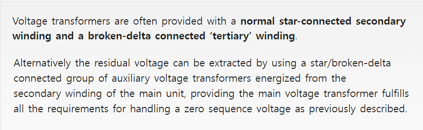 (계기용 변압기는 종종 일반적인 스타 연결된 2차 권선과 개방 델타로 연결된 제3의 권선과 함께 공급될 수 있습니다. 대안으로 잔류 전압은 메인 계기용 변압기의 2차 권선으로부터 가압되는 보조 계기용 변압기를 스타/개방 델타로 연결하여 사용함으로 추출될 수 있습니다. 이때 메인 계기용 변압기는 이전에 설명된 영상 전압을 다루기 위해 요구되는 모든 조건을 만족시켜야 합니다.)