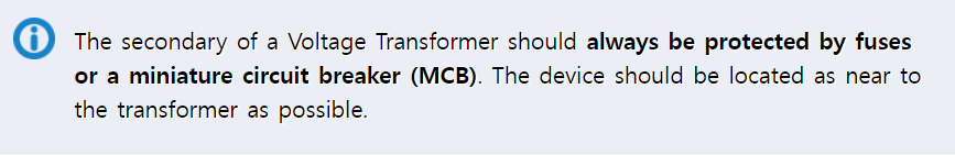 계기용 변압기의 2차는 항상 퓨즈나 MCB에 의해서 보호되어야 합니다. 이 장치는 가능한 한 변압기에 가깝게 설치되어야 합니다.