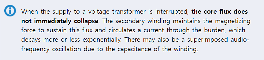 (계기용 변압기의 1차 전원이 차단될때 철심의 자속이 즉시 사라지지는 않습니다. 2차 권선은 이 자속을 지속하기 위한 자화력을 유지하고 부하 전류를 흐르게 하는데 이는 지수함수보다 조금 길거나 짧게 감쇠됩니다. 또한 권선의 캐페시턴스에 의해서 겹쳐진 가청 주파수 진동이 있을 수 있습니다.)