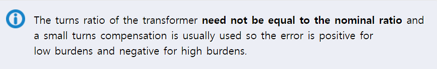 (변압기의 권선비는 변압비와 일치할 필요가 없습니다. 작은 권선 보상 (small turns compensation)이 보통 사용되는데 그래서 오차는 낮은 부담에서는 양이고 높은 부담에서는 음이 됩니다.)