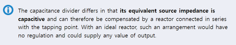 정전용량 분배기는 그것의 등가 전원 임피던스가 용량성인것과 그러므로 탭핑 지점과 직렬로 리액터를 연결함으로 보상될 수 있다는 점에서 다릅니다. 이상적인 리액터의 경우 그런 배치는 제한이 없고 출력의 어떠한 값도 공급할 수 있습니다.