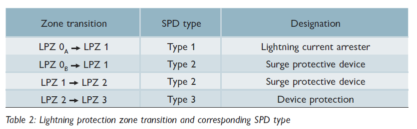 저압 수전반과 변압기의 저압측 주 배전반에는 의무적으로 Ⅰ등급 또는 Ⅱ등급의 SPD를 설치하여야 합니다. 위에서 설명한 것과 같이 각 존별 경계선에 설치되어야 하는 SPD의 등급은 다음과 같습니다. (Type 1 - Ⅰ등급, Type 2 - Ⅱ등급, Type 3 - Ⅲ등급)
