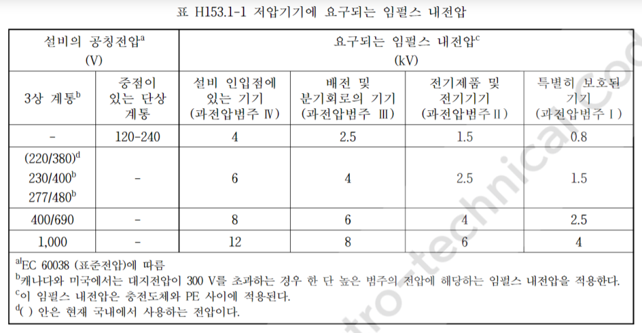 보호되는 저압 기기의 임펄스 내전압 기준은 다음과 같습니다. SPD는 이 내전압 기준보다 낮은 정격을 가지는 것을 선택해야 합니다.
