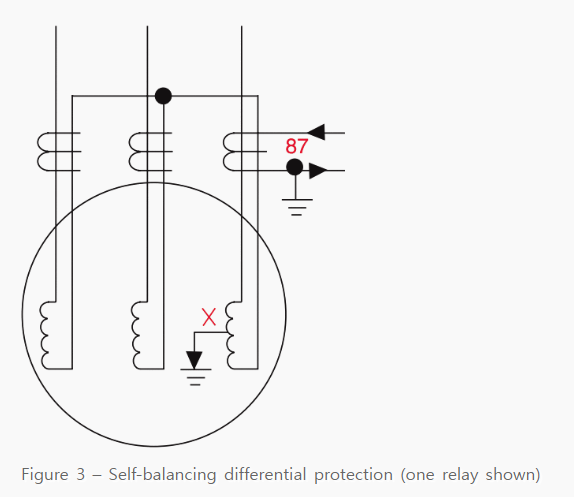 - 이 보호 방식에서 1차 검출 전류는 일반적인 차동 방식의 CT 비의 절반 정도가 되는데 이는 양 방식이 모두 전부하 전류를 검출해야 하기 때문입니다. 반면에 자율 균형 차동 방식은 1차 검출 전류가 작습니다.